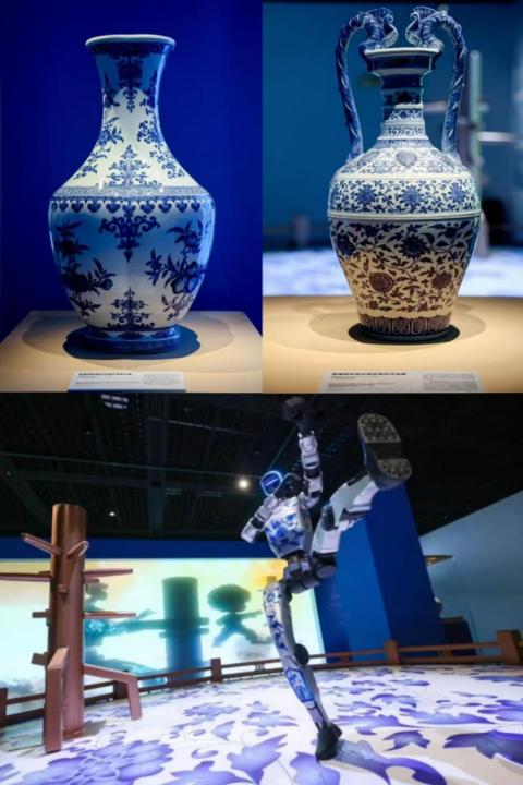不同于文物与IP的简单叠加,这场艺术秀真正让古今实现了“双向对话”。在“玉见未来”展区,四千多年前的“玉神人”经潮流转译,化作戴未来感冠帽的“周同学”巨像投影,静静诉说中国玉石之美;“青铜跨时代”里,大克鼎的纹路被融入铠甲设计,“青铜卫士周同学”守护着文化宝藏,10000张古钱币造型的数字收藏卡,串联起古今对富足生活的共同向往;“青花武馆”中,上海博物馆馆藏的景德镇窑青花缠枝莲纹双耳瓶、青花折枝山茶纹扁壶悉数亮相,身绘青花纹样的功夫机器人站上擂台,让非遗匠心与科技活力同台绽放;而“粉彩浪漫”展区则紧扣周杰伦钟爱的粉色,聚焦清代乾隆年间的粉彩堆塑婴戏瓶、粉彩莲纹盖碗,让观众在柔美感中对话古人的浪漫。